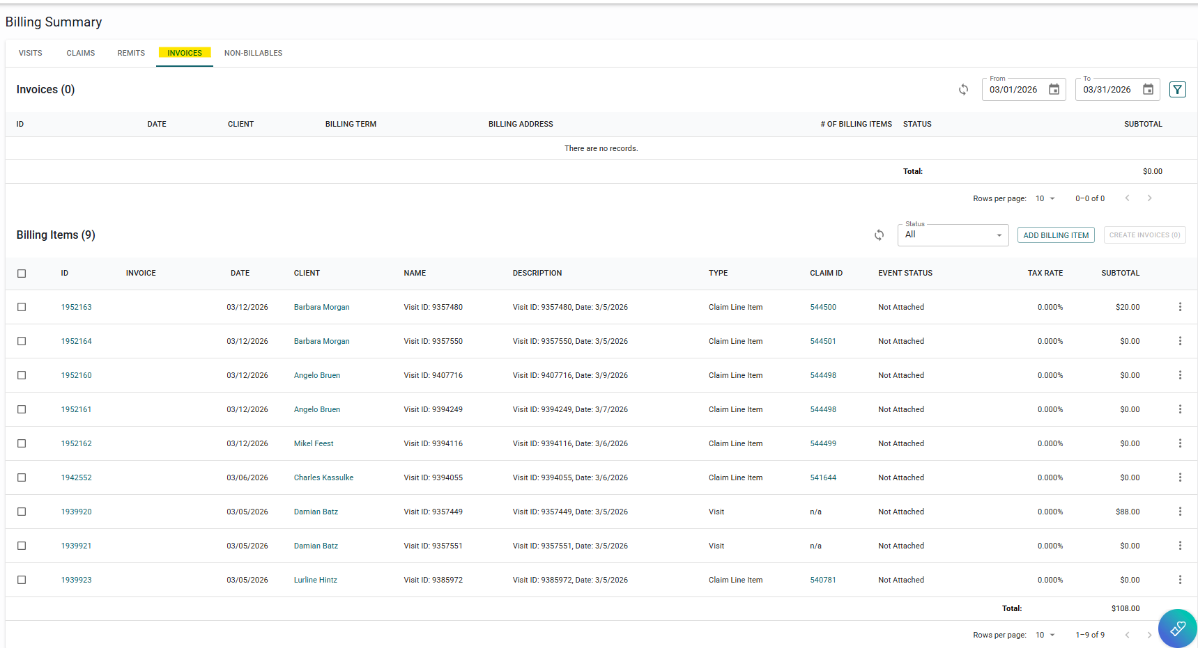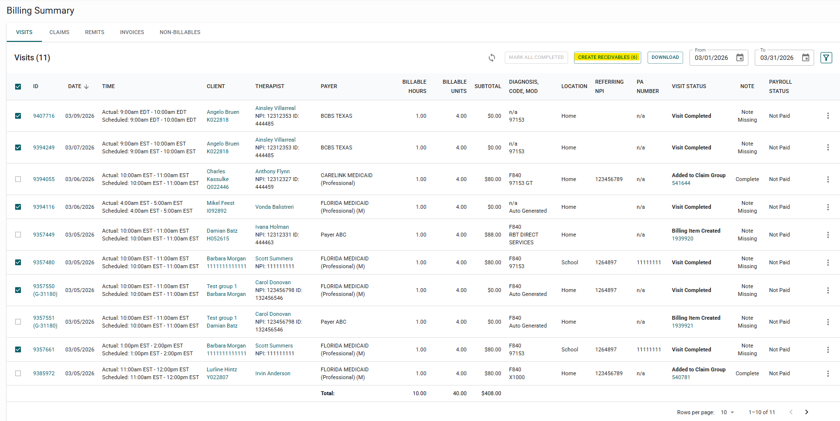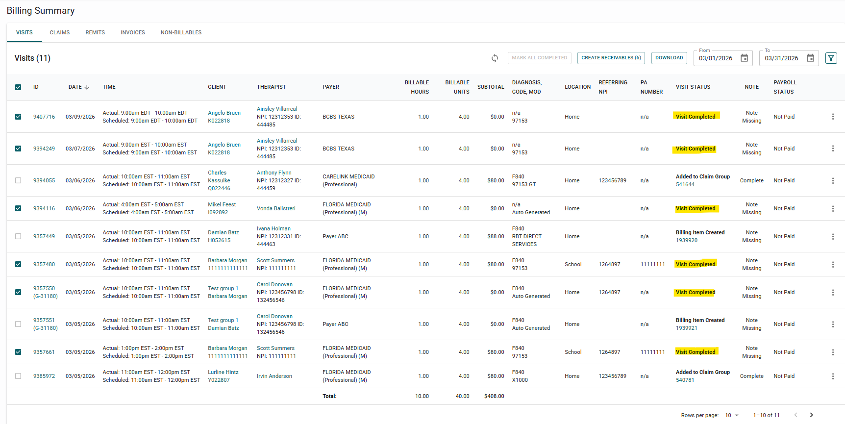 Completed visits for payers connected to a clearinghouse will have a checkbox in the very first column in the billing summary.