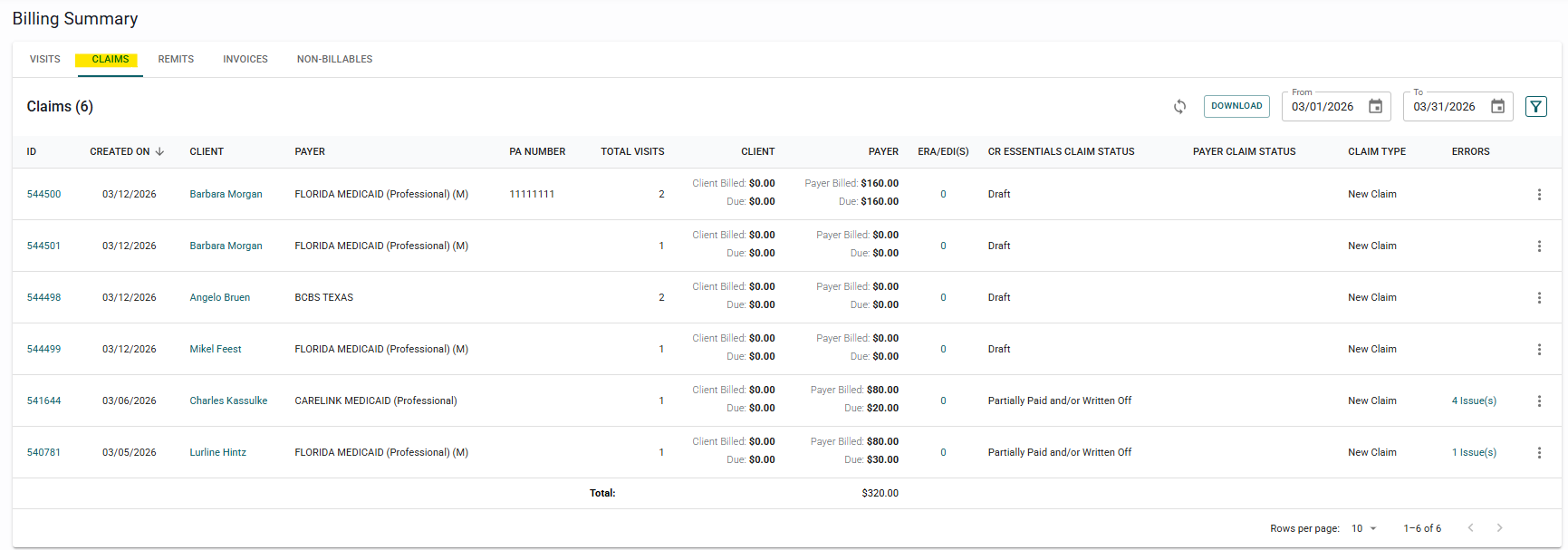 Once the "create receivables" button is pressed, the status of those visits will change from "Visit Completed" to "Added to Claim Group". Beside the visit tab, you will find the claims tab. In that tab, you'll find all created claims. Recently created claims will show up as drafts.