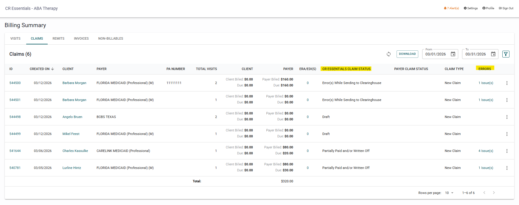 Once sent, you will see a "queued for validation against clearinghouse" status which means the claim is being checked. After the validation is done, it will either be "successfully send to clearinghouse" or it will have "error(s) while sending to the clearinghouse. If it has errors, you are able to see the error codes by clicking on the number of issues in the error column.