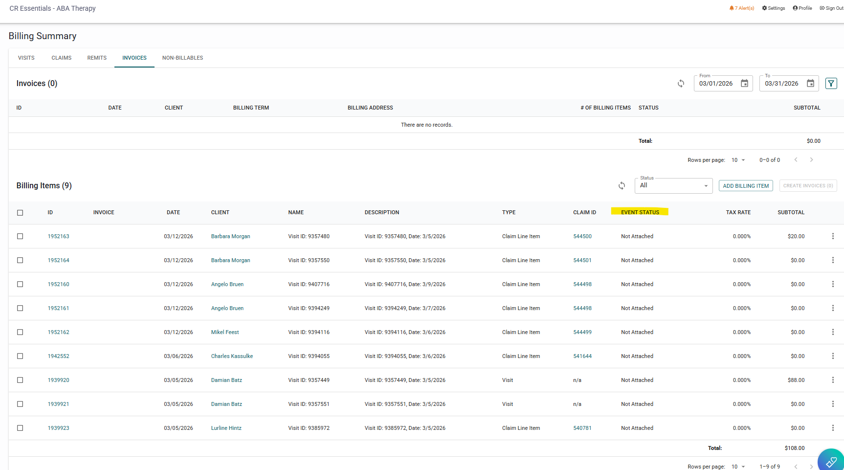 In the billing items, you will see that the default status is "Not attached".