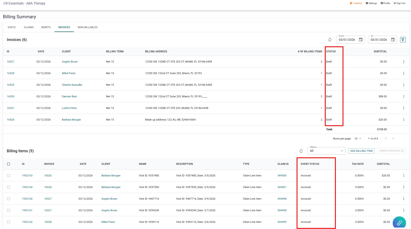Once the invoice draft has been created, the billing items status will then change to "invoiced" and the invoice created would be shown above, in the invoices section.