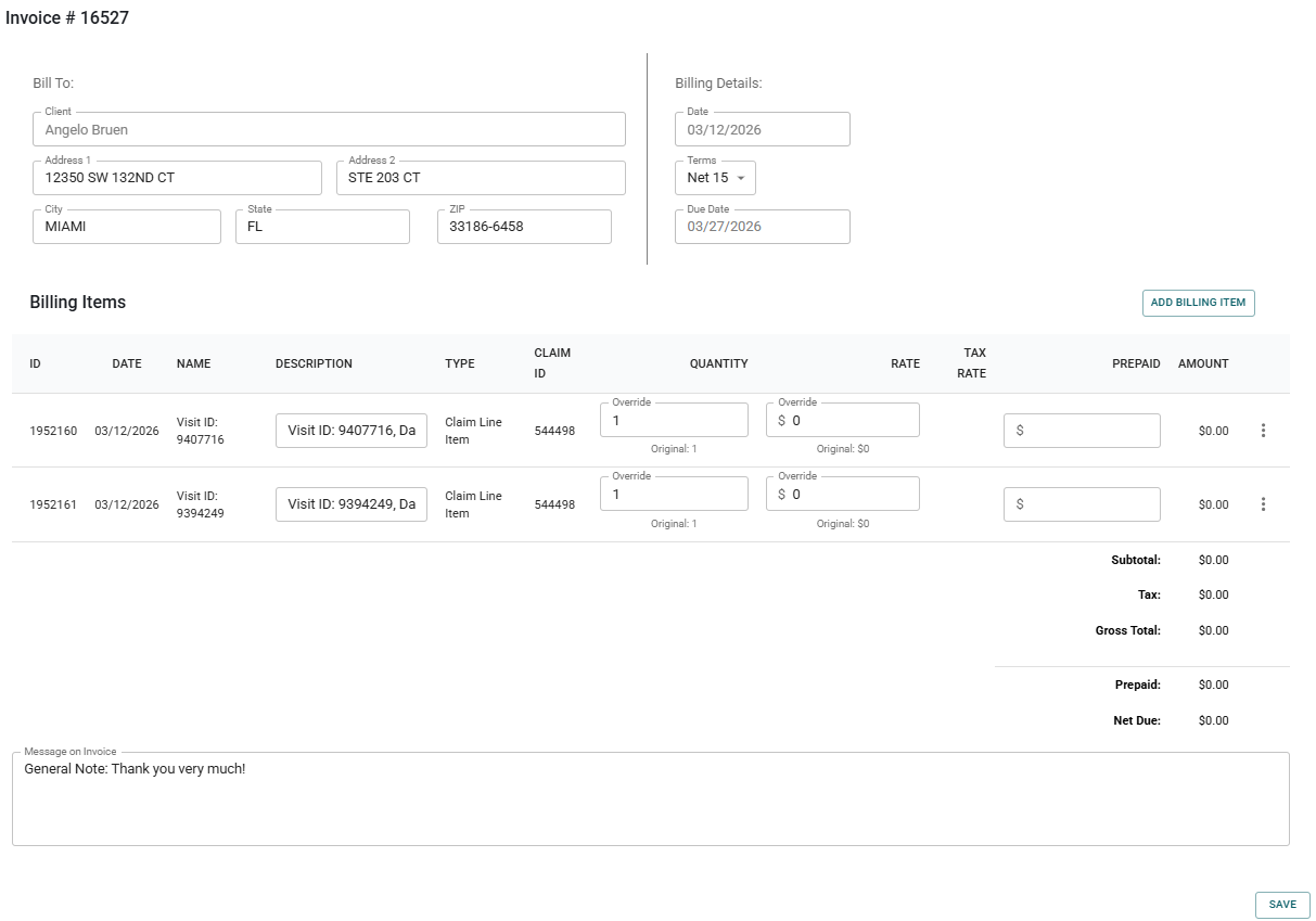 Once that invoice draft is created, you can download it as a pdf, send it to the caregiver portal, edit it or delete it. If you click on edit you will see the billing items and the total. You are able to add customized billing items here, select the terms (Net Due, Net 15, Net 30, Net 45), and also include a message in your invoice before you send it.