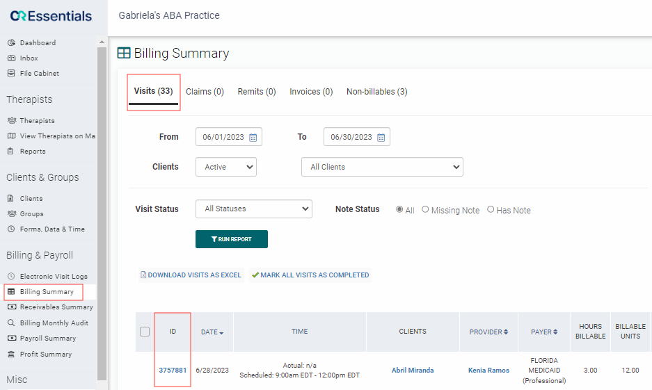 Diríjase a Billing Summary, en el panel de navegación izquierdo, asegurese que la tab de Visits está selecionada. En la primera columna del Resumen, de Facturación podrá encontara los Visit IDs.