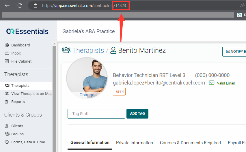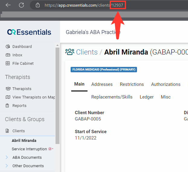 Diríjase a Therapists, en el panel de navegación Izquierdo, seleccione el terapeuta para acceder al perfil del terapeuta. Encontrará el ID del cliente en el URL de la barra web, los últimos 5 digitos.