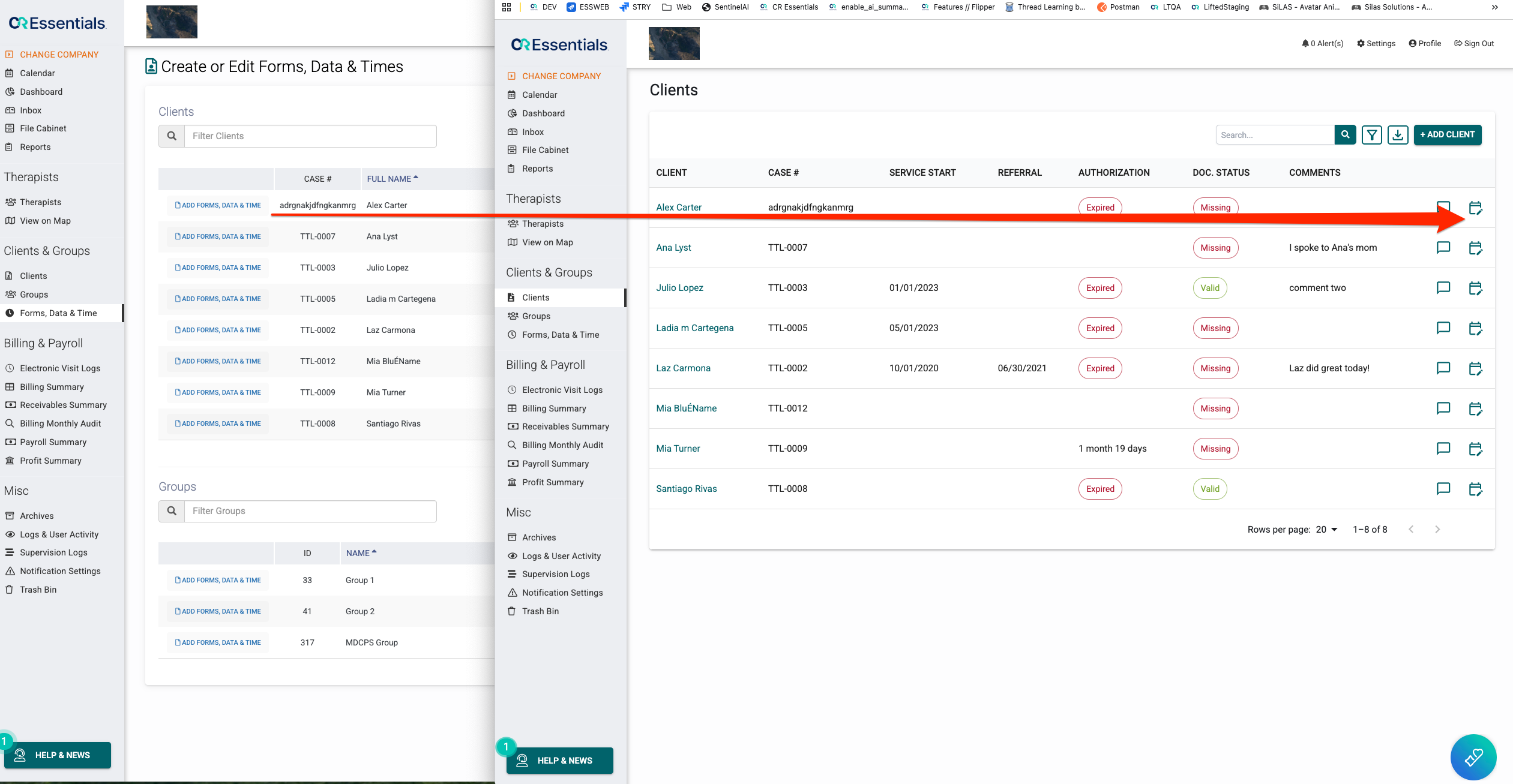 The Forms, Data & Time page has been removed from the left navbar, as it was used to access the legacy calendar. To view a client's calendar, go to Clients -> Calendar Icon.