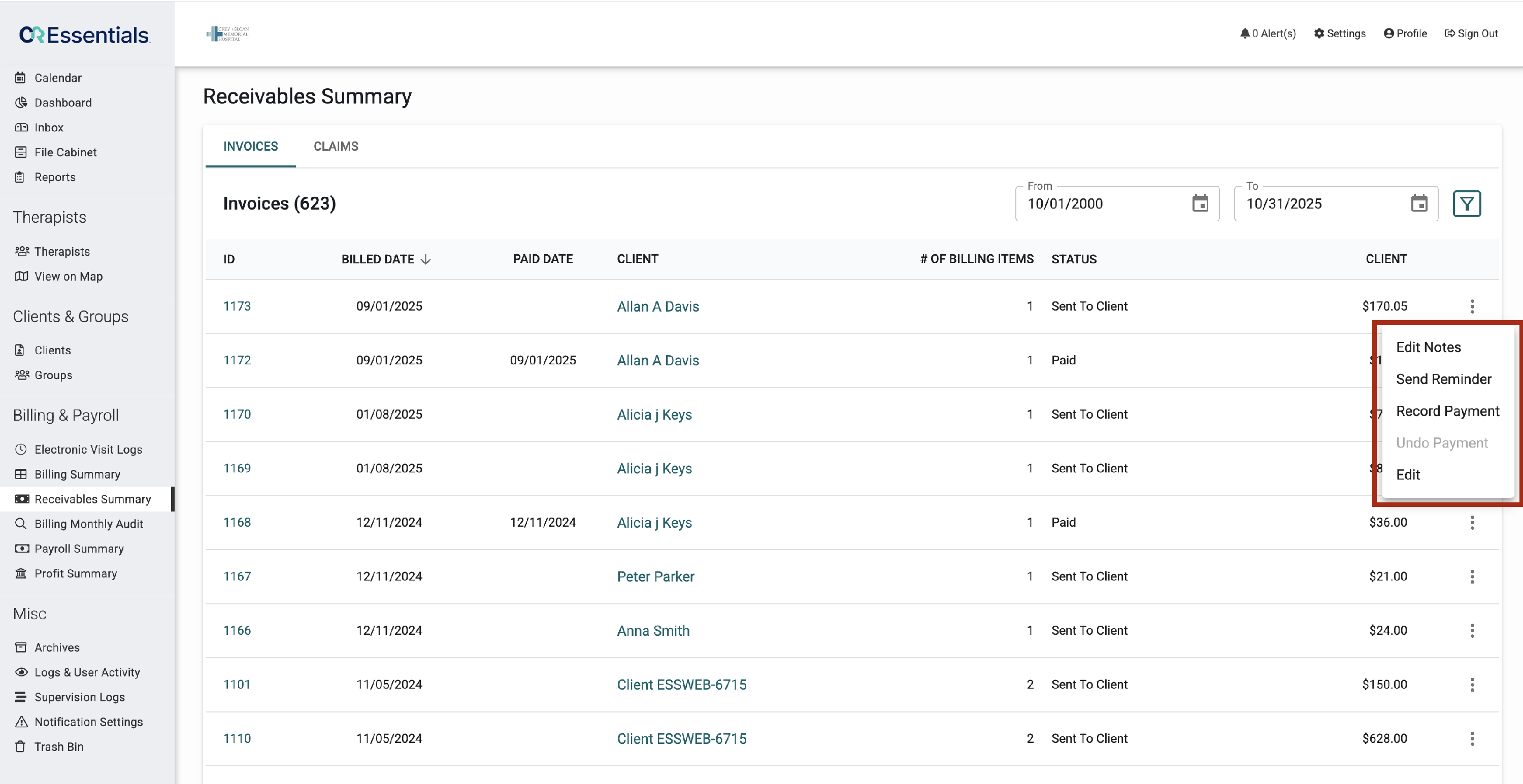 The Receivables Summary provides a complete view of all invoices and insurance claims that have been billed and are awaiting payment or reconciliation.