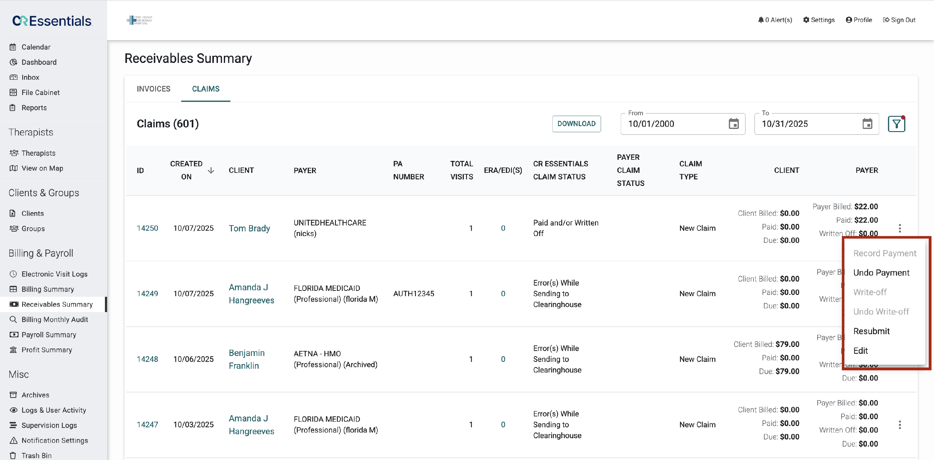 - Resubmit – Re-send the claim to the clearinghouse after corrections.
