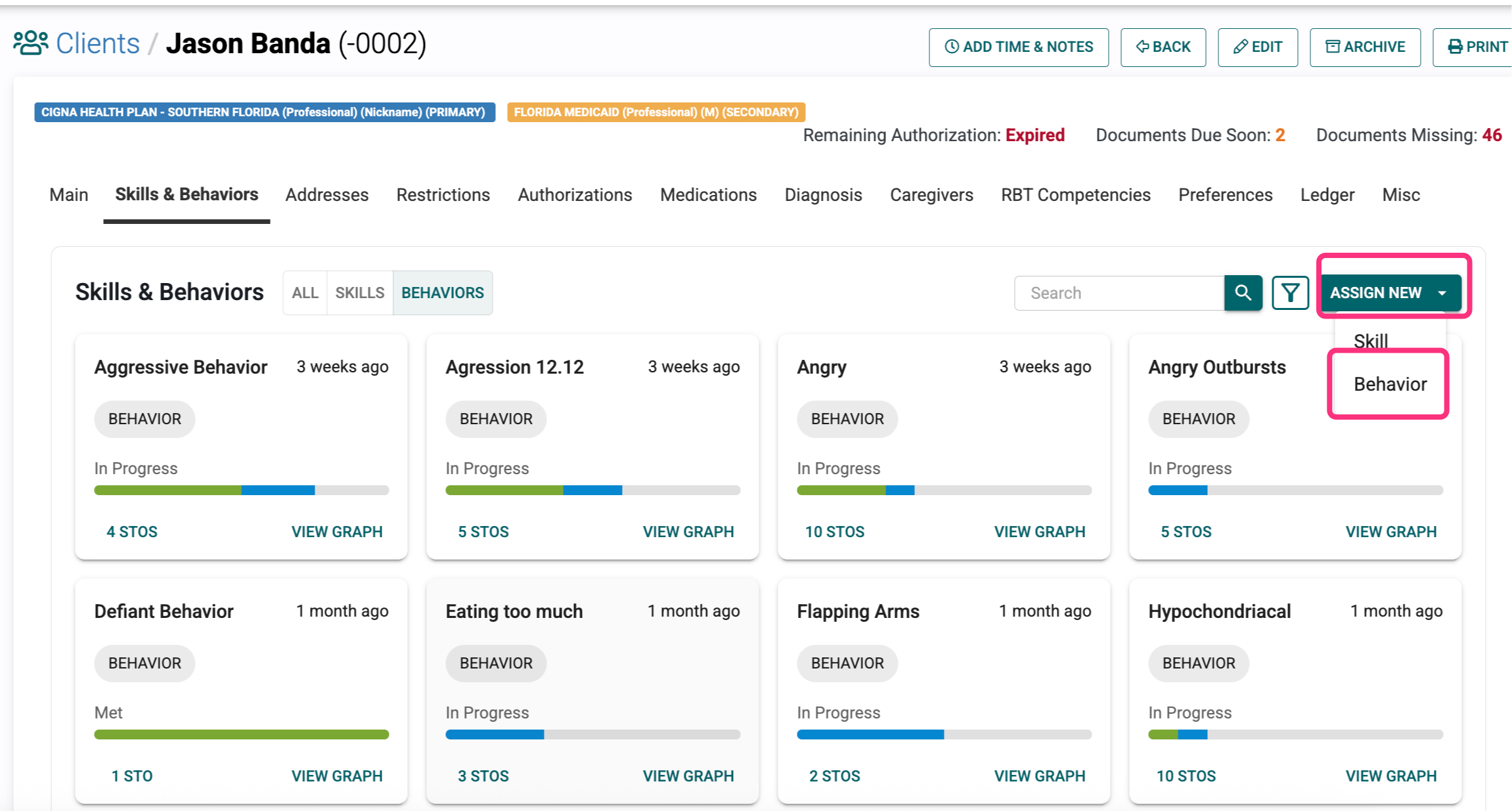 To start recording a Behavior event for a client, you have to first assign and set up the behavior.